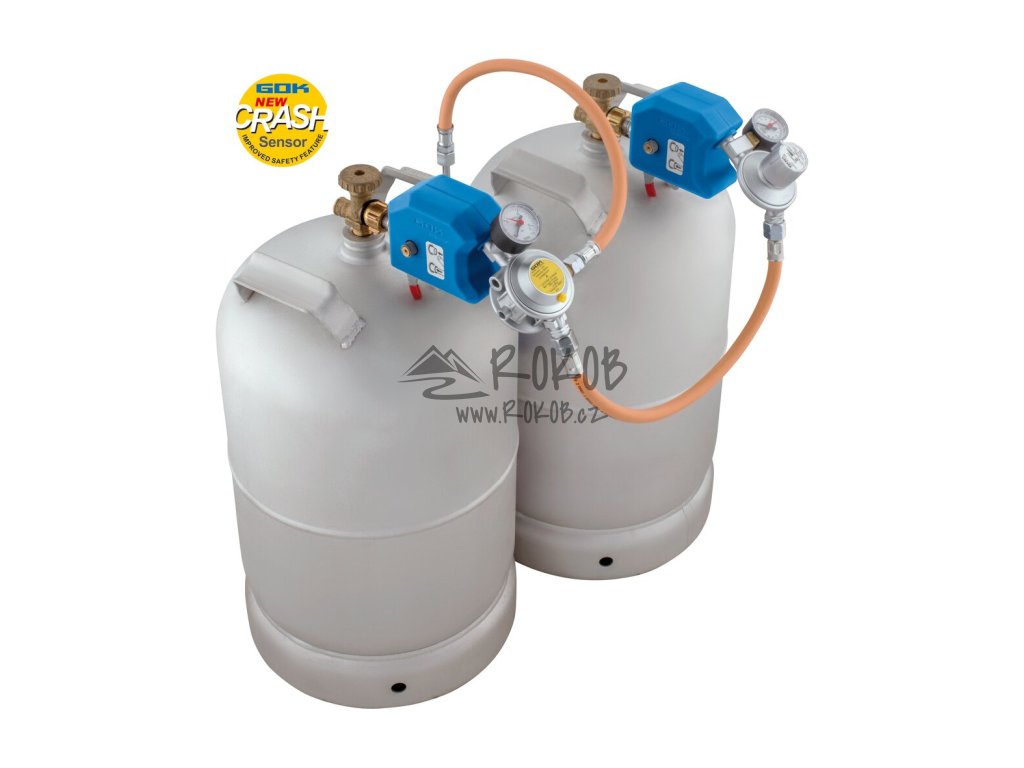 Systém automatického bezpečnostního tlakového spínače plynu pro provoz dvouválcových systémů v obytných automobilech a karavanech během cestování, pro přímé připojení k plynovým lahvím.