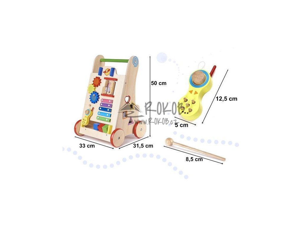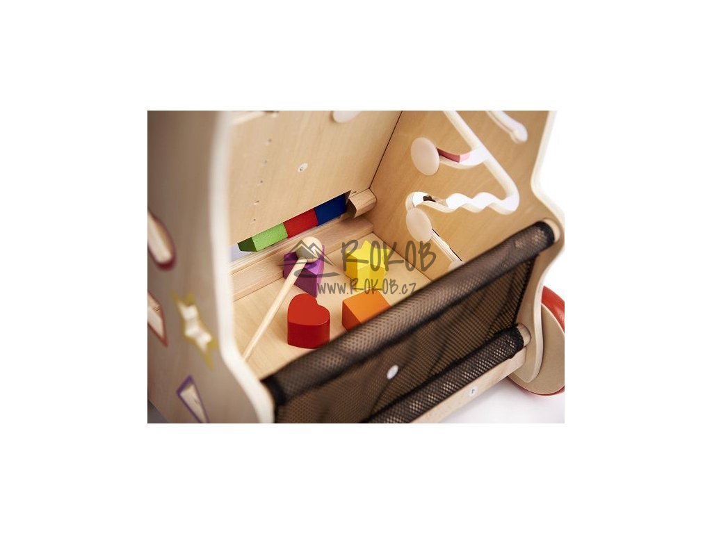 V přední části odstrkovadla je manipulační deska plná prvků, které potěší děti: