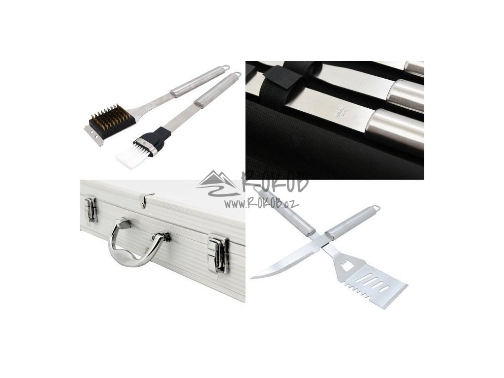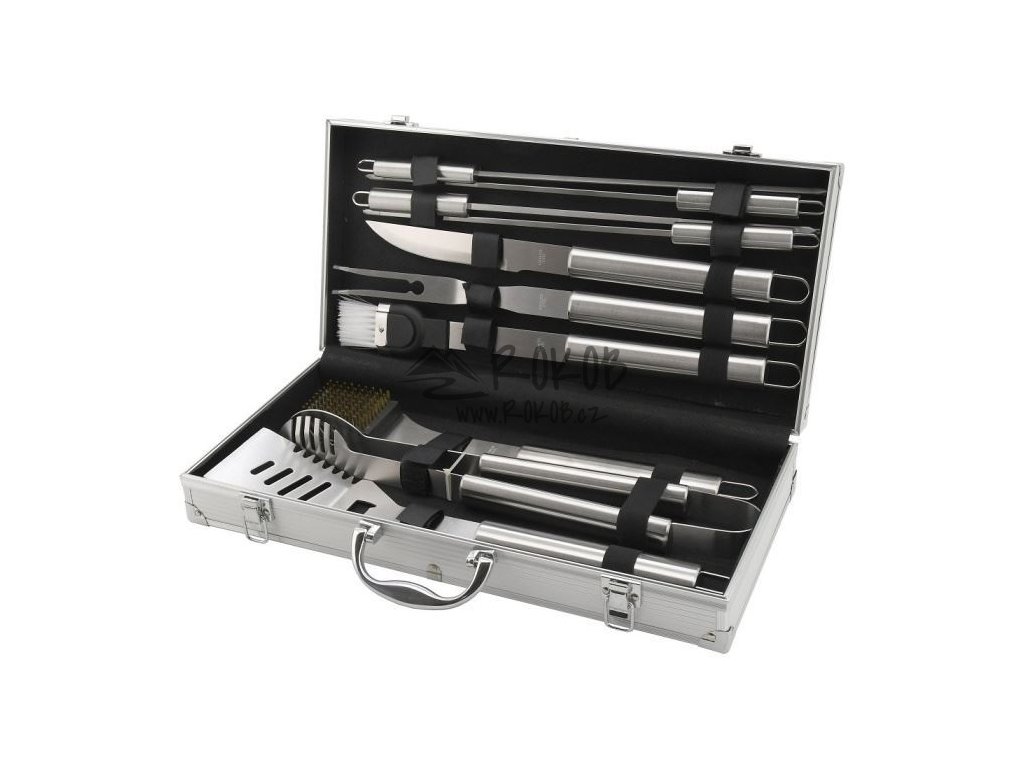 V sadě se nachází obracečka s precizně zabroušenou hranou vybavená zoubkovaným ostřím, otvírákem zátek a otvory pro odtok. Kleště, speciálně tvarované pro jistý úchop nejrůznějších pokrmů, kartáč pro údržbu grilu, kdy samotná kartáčová část je z mosazi. Nepostradatelnou částí grilovacího nářadí je i dvouzubá vidlička, štětec se štětinami z nylonu, pro potírání, či mašlování pokrmů, porcovací nůž a4x grilovací jehlice s hroty broušenými do špičky.