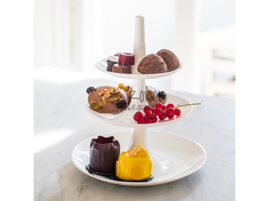 Nejmenší z řady etažéru pojme najednou více věcí, než se může na první pohled zdát. Sladký bar, cukrovinky nebo ovoce se budou vyjímat na tomto třípatrovém tácu a přitom nezaberou místo. Můžete ho použít kdekoli v domácnosti, ale i na vašich dovolených, jelikož je z lehkého a odolného plastu a dá se složit důmyslně do sebe.