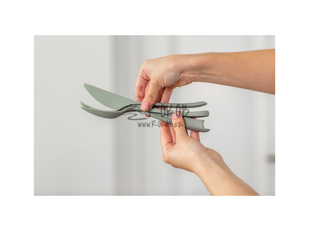 Nůž, vidlička, lžíce - připraveno! Konečně rozumný to go příbor bez ozdob a plně funkční. Všechny díly můžou být hladce rozebrány a zase složeny do sebe. Chcete-li jej uvolnit, jednoduše zvedněte nůž na špičce a uvolněte jej. Všechny části příboru leží dobře v ruce a svou velikostí i lehkostí se vejdou do každé tašky či piknikového košíku.