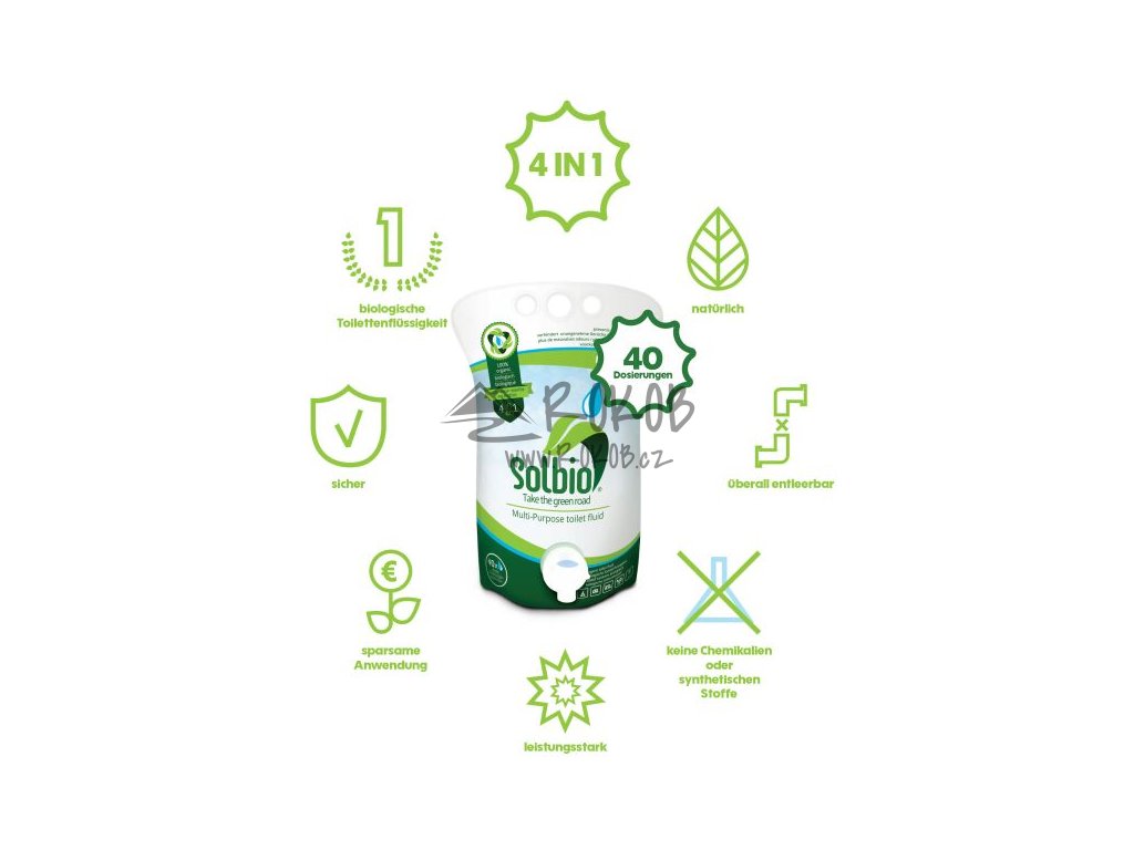 Rozkladová chemie Solbio je 100% ekologická. Neobsahuje žádné chemikalie, které by škodily životnímu prostředí. Bezpečná receptura a svěží aroma, které potlačuje zápach.