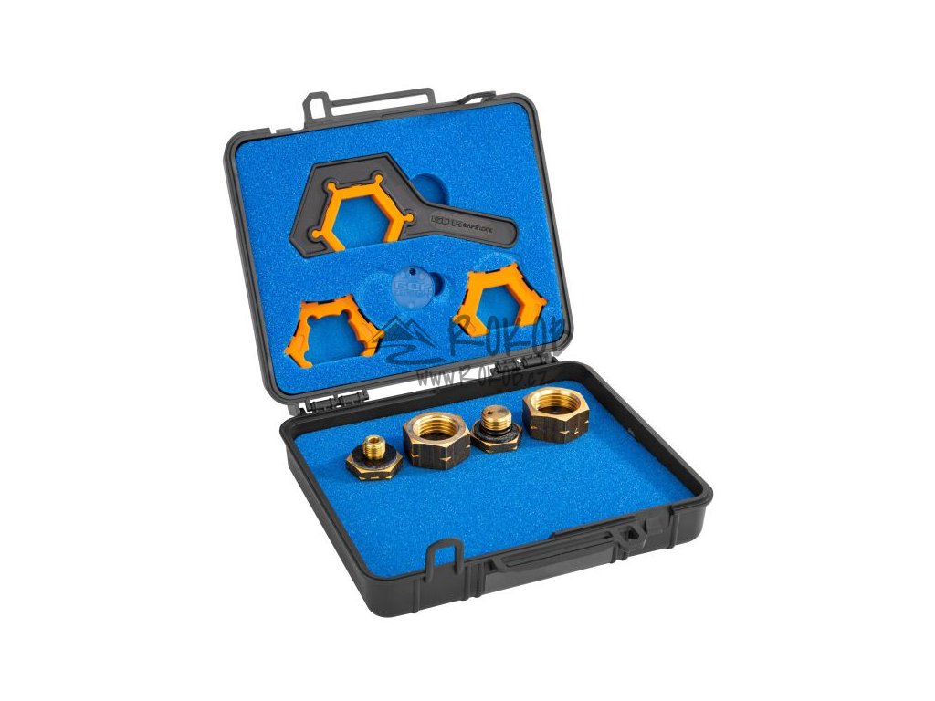 Obsahuje vše, co potřebujete k připojení regulátoru tlaku s připojením G12 k plynovým lahvím běžně používaným na evropském trhu, a může být uložen po ruce ve vozidle. Pouze jedno nářadí se třemi různými, vyměnitelnými vložkami, vhodnými pro připojení evropských lahví.