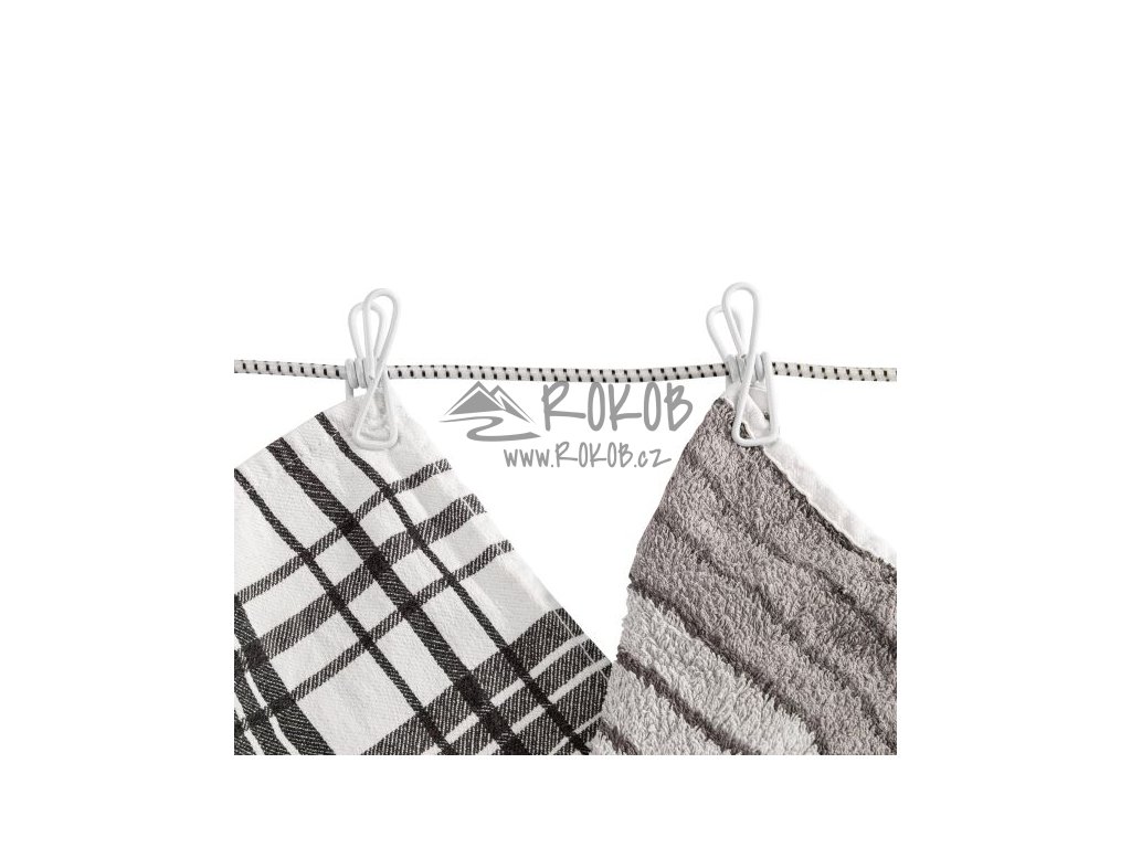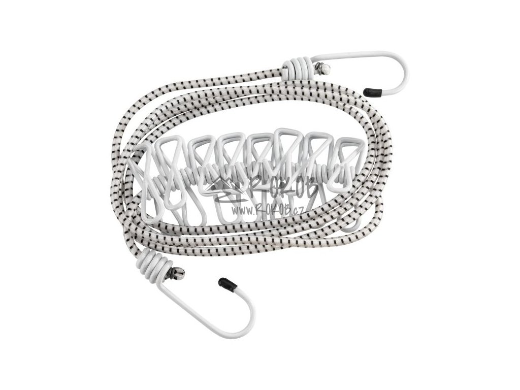 Elastická šňůra na sušení prádla s 8 integrovanými kolíčky a nastavitelnou délkou 115–180 cm. Praktický doplněk pro kempování i domácnost.