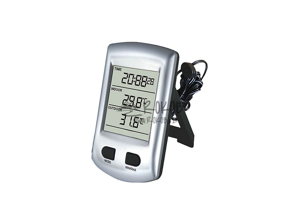 Spolehlivé hodiny řízené signálem DCF s vnějším a vnitřním teploměrem. Velmi dlouhá výdrž baterií, paměť pro minima a maxima naměřených hodnot. K zavěšení nebo postavení na stojan.