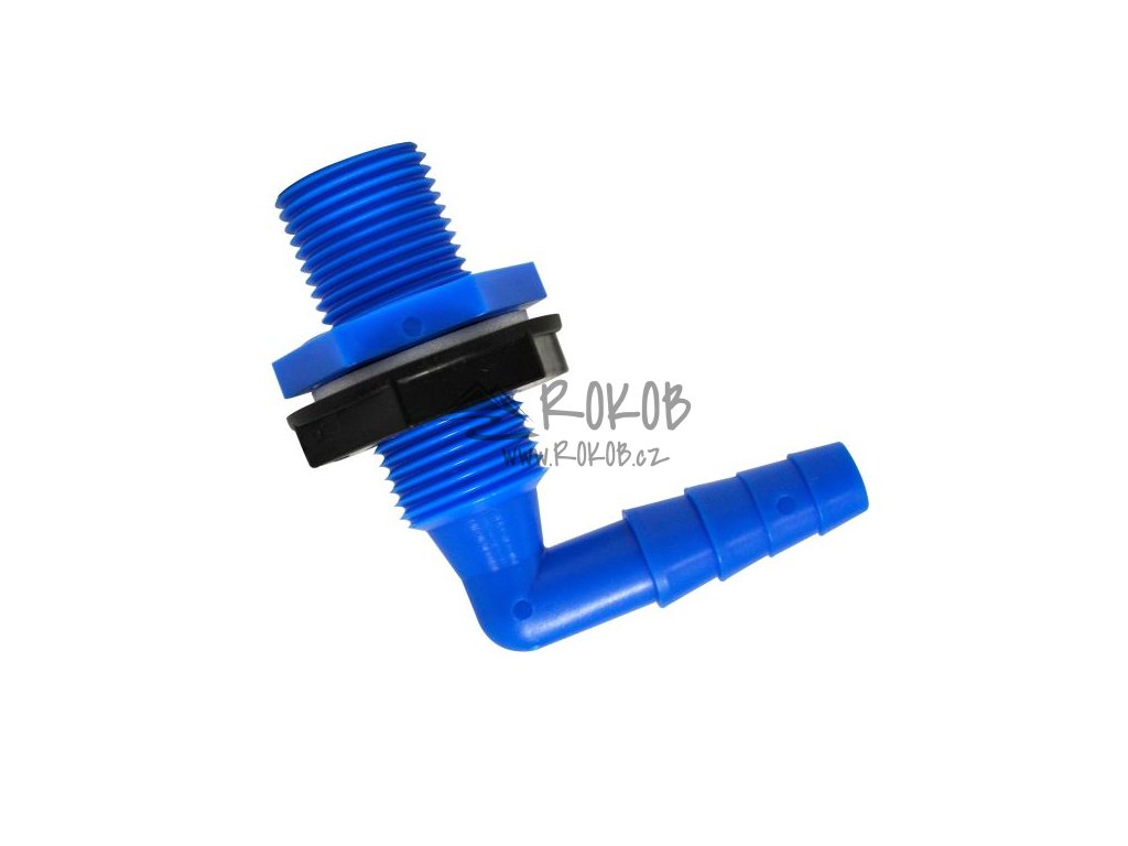 Úhlová průchodka nádrže s 1/2" závitem a nástavcem pro hadice Ø 10–12 mm