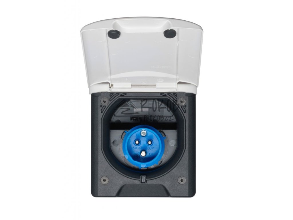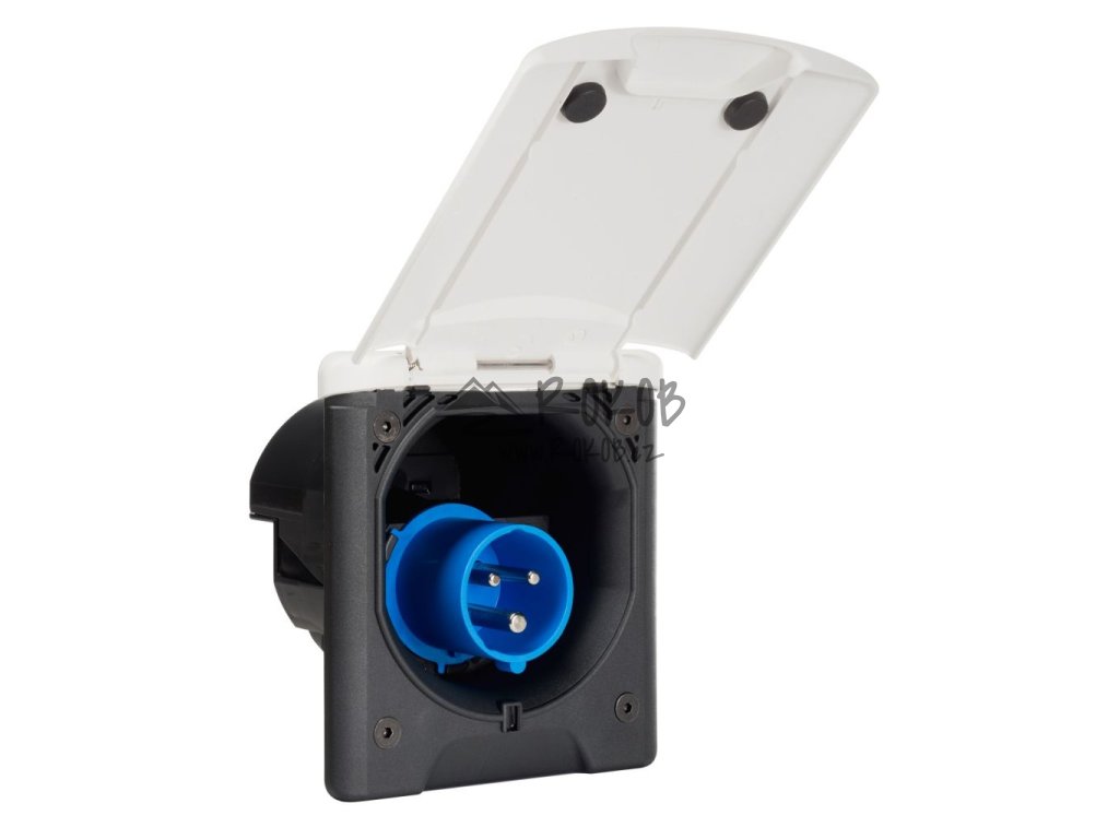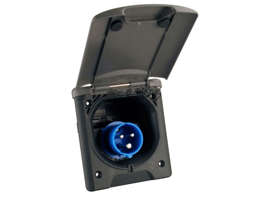 Venkovní CEE zásuvka s magnetickým výklopným víkem a voděodolným zadním krytem.